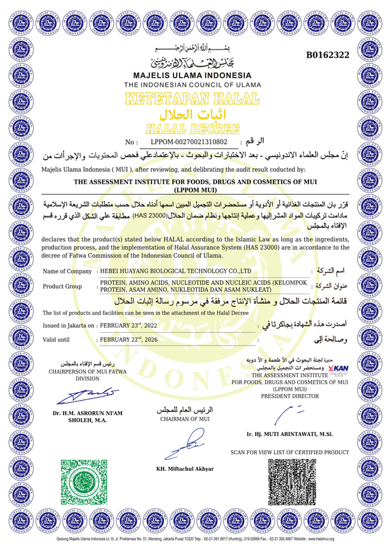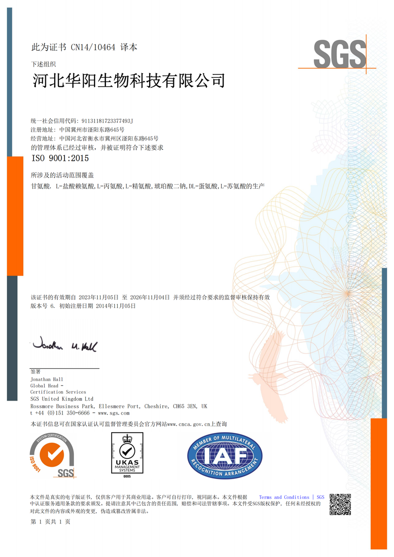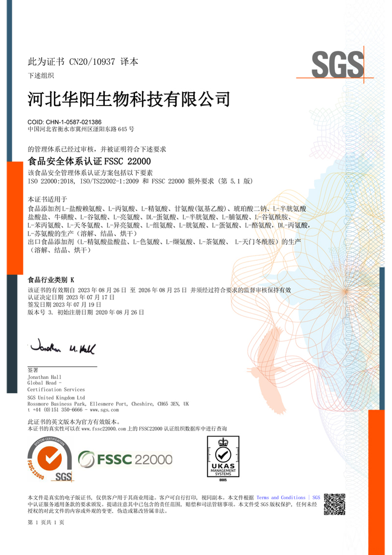 河北華陽集團(tuán)坐落于河北省衡水市冀州區(qū)省級工業(yè)園區(qū)(始建于1987年,前身為冀州市華陽化工有限責(zé)任公司)。集團(tuán)下屬四個公司:河北華陽生物科技有限公司、河北華悅氨基酸科技有限公司、滄州華晨生物科技有限公司、衡水市陽力商貿(mào)有限公司。主要生產(chǎn)甘氨酸、L-丙氨酸、L-蘇氨酸、DL-蛋氨酸、L-賴氨酸鹽酸鹽、L-半胱氨酸鹽酸鹽、干貝素等氨基酸系列食品級產(chǎn)品,廣泛應(yīng)用于食品、飲料、飼料等行業(yè)。......